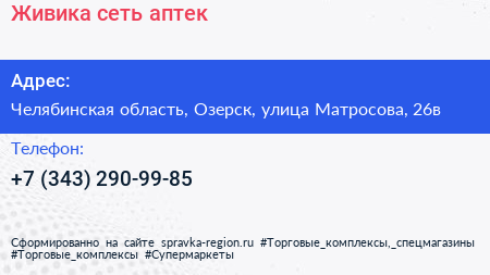 Живика, сеть аптек по адресу Челябинская область, Озерск, улица Матросова, 26в в дальнейшем Организация, размещена в следующих категориях:
