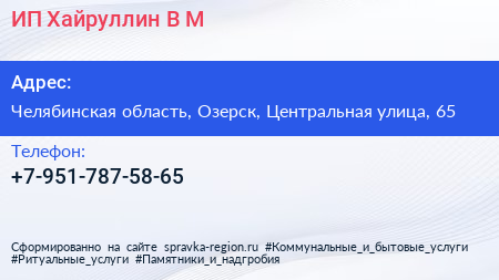 ИП Хайруллин В.М. по адресу Челябинская область, Озерск, Центральная улица, 65 в дальнейшем Организация, размещена в следующих категориях: