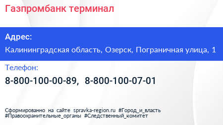 Газпромбанк, терминал по адресу Калининградская область, Озерск, Пограничная улица, 1 в дальнейшем Организация, размещена в следующих категориях: