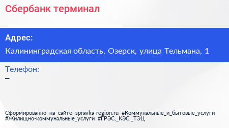 Сбербанк, терминал по адресу Калининградская область, Озерск, улица Тельмана, 1 в дальнейшем Организация, размещена в следующих категориях: