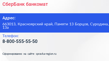 СберБанк, банкомат по адресу 663013, Красноярский край, Памяти 13 Борцов, Суродина, 13а в дальнейшем Организация, размещена в следующих категориях: