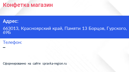 Конфетка, магазин по адресу 663013, Красноярский край, Памяти 13 Борцов, Гурского, 69Б в дальнейшем Организация, размещена в следующих категориях:
