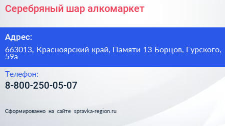 Серебряный шар, алкомаркет по адресу 663013, Красноярский край, Памяти 13 Борцов, Гурского, 59а в дальнейшем Организация, размещена в следующих категориях: