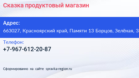 Сказка, продуктовый магазин по адресу 663027, Красноярский край, Памяти 13 Борцов, Зелёная, 3а в дальнейшем Организация, размещена в следующих категориях: