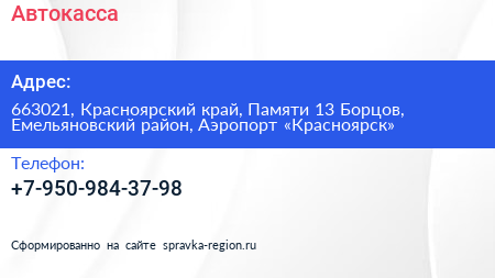 Автокасса по адресу 663021, Красноярский край, Памяти 13 Борцов, Емельяновский район, Аэропорт «Красноярск» в дальнейшем Организация, размещена в следующих категориях:
