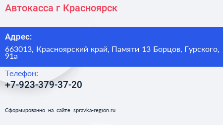 Автокасса, г. Красноярск по адресу 663013, Красноярский край, Памяти 13 Борцов, Гурского, 91а в дальнейшем Организация, размещена в следующих категориях: