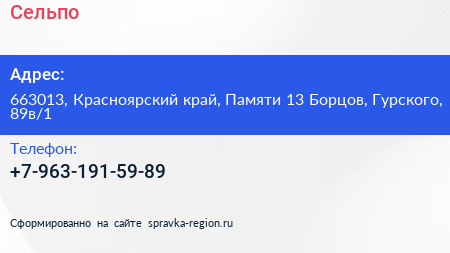 Сельпо по адресу 663013, Красноярский край, Памяти 13 Борцов, Гурского, 89в/1 в дальнейшем Организация, размещена в следующих категориях: