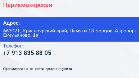 Парикмахерская по адресу 663021, Красноярский край, Памяти 13 Борцов, Аэропорт Емельяново, 1в в дальнейшем Организация, размещена в следующих категориях: