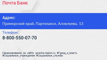 Почта Банк по адресу Приморский край, Партизанск, Аллилуева, 13 в дальнейшем Организация, размещена в следующих категориях:
