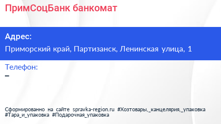 ПримСоцБанк, банкомат по адресу Приморский край, Партизанск, Ленинская улица, 1 в дальнейшем Организация, размещена в следующих категориях: