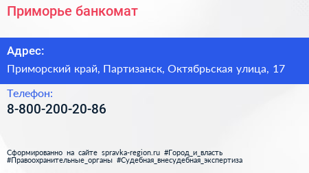 Приморье, банкомат по адресу Приморский край, Партизанск, Октябрьская улица, 17 в дальнейшем Организация, размещена в следующих категориях: