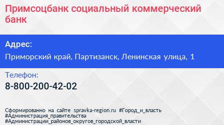 Примсоцбанк, социальный коммерческий банк по адресу Приморский край, Партизанск, Ленинская улица, 1 в дальнейшем Организация, размещена в следующих категориях: