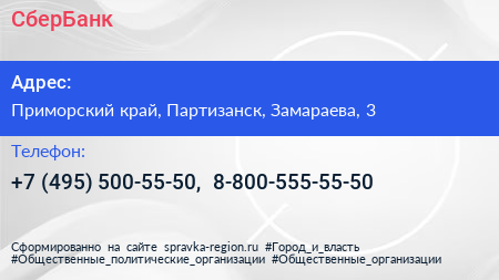 СберБанк по адресу Приморский край, Партизанск, Замараева, 3 в дальнейшем Организация, размещена в следующих категориях: