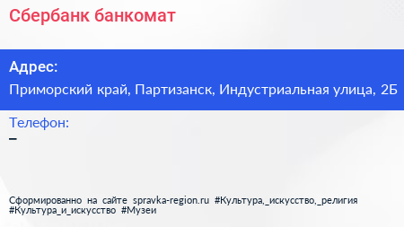 Сбербанк, банкомат по адресу Приморский край, Партизанск, Индустриальная улица, 2Б в дальнейшем Организация, размещена в следующих категориях: