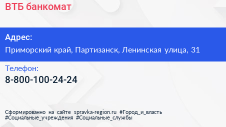 ВТБ, банкомат по адресу Приморский край, Партизанск, Ленинская улица, 31 в дальнейшем Организация, размещена в следующих категориях: