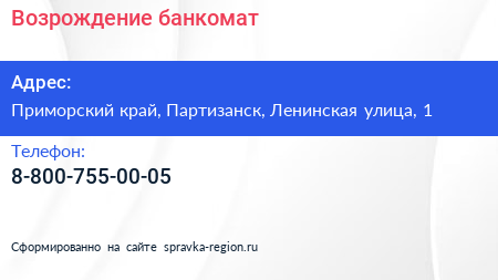 Возрождение, банкомат по адресу Приморский край, Партизанск, Ленинская улица, 1 в дальнейшем Организация, размещена в следующих категориях: