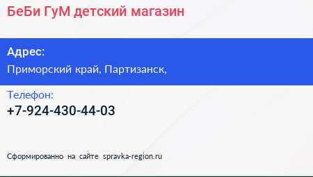 БеБи ГуМ, детский магазин по адресу Приморский край, Партизанск, в дальнейшем Организация, размещена в следующих категориях:
