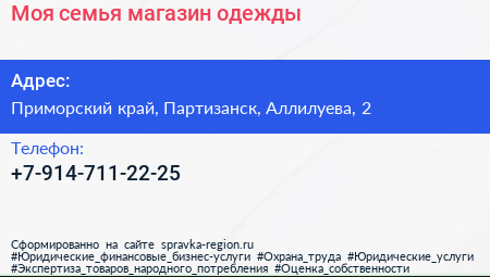 Моя семья, магазин одежды по адресу Приморский край, Партизанск, Аллилуева, 2 в дальнейшем Организация, размещена в следующих категориях: