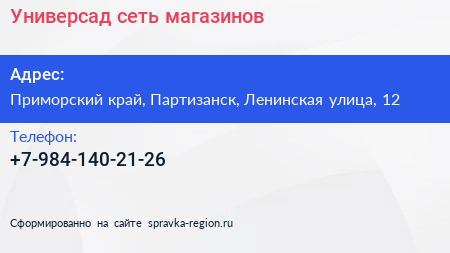 Универсад, сеть магазинов по адресу Приморский край, Партизанск, Ленинская улица, 12 в дальнейшем Организация, размещена в следующих категориях: