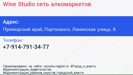 Wine Studio, сеть алкомаркетов по адресу Приморский край, Партизанск, Ленинская улица, 8 в дальнейшем Организация, размещена в следующих категориях: