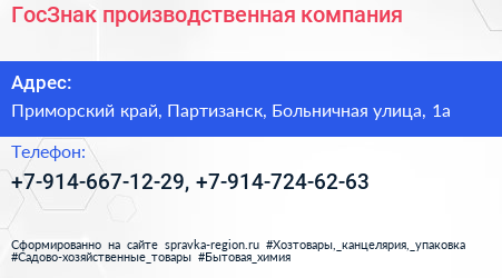 ГосЗнак, производственная компания по адресу Приморский край, Партизанск, Больничная улица, 1а в дальнейшем Организация, размещена в следующих категориях: