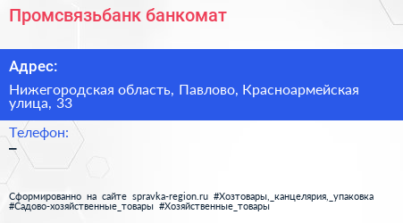 Промсвязьбанк, банкомат по адресу Нижегородская область, Павлово, Красноармейская улица, 33 в дальнейшем Организация, размещена в следующих категориях: