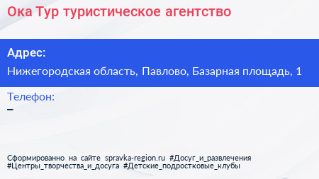 Ока-Тур, туристическое агентство по адресу Нижегородская область, Павлово, Базарная площадь, 1 в дальнейшем Организация, размещена в следующих категориях: