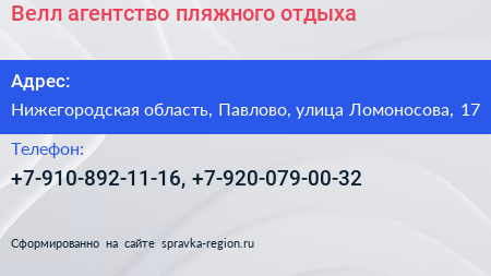 Велл, агентство пляжного отдыха по адресу Нижегородская область, Павлово, улица Ломоносова, 17 в дальнейшем Организация, размещена в следующих категориях: