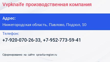 Vvpknaife, производственная компания по адресу Нижегородская область, Павлово, Подзол, 10 в дальнейшем Организация, размещена в следующих категориях: