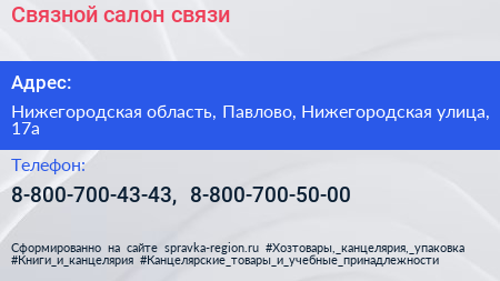 Связной, салон связи по адресу Нижегородская область, Павлово, Нижегородская улица, 17а в дальнейшем Организация, размещена в следующих категориях:
