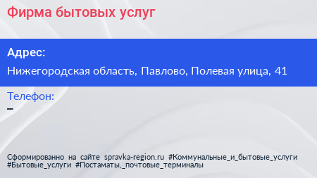Фирма бытовых услуг по адресу Нижегородская область, Павлово, Полевая улица, 41 в дальнейшем Организация, размещена в следующих категориях: