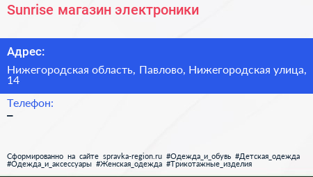 Sunrise, магазин электроники по адресу Нижегородская область, Павлово, Нижегородская улица, 14 в дальнейшем Организация, размещена в следующих категориях: