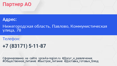 Партнер, АО по адресу Нижегородская область, Павлово, Коммунистическая улица, 78 в дальнейшем Организация, размещена в следующих категориях: