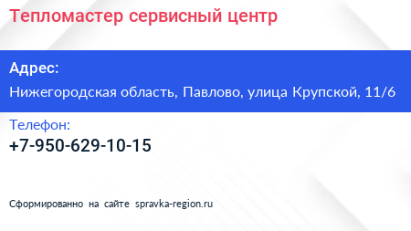 Тепломастер, сервисный центр по адресу Нижегородская область, Павлово, улица Крупской, 11/6 в дальнейшем Организация, размещена в следующих категориях: