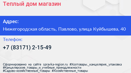 Теплый дом, магазин по адресу Нижегородская область, Павлово, улица Куйбышева, 40 в дальнейшем Организация, размещена в следующих категориях: