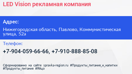 LED-Vision, рекламная компания по адресу Нижегородская область, Павлово, Коммунистическая улица, 52а в дальнейшем Организация, размещена в следующих категориях: