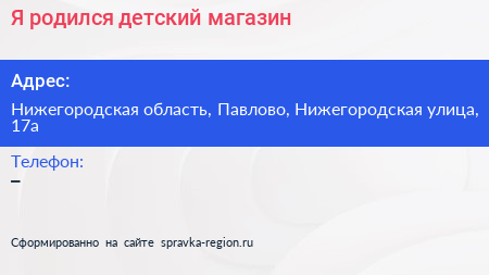 Я родился, детский магазин по адресу Нижегородская область, Павлово, Нижегородская улица, 17а в дальнейшем Организация, размещена в следующих категориях: