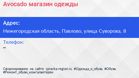 Avocado, магазин одежды по адресу Нижегородская область, Павлово, улица Суворова, 8 в дальнейшем Организация, размещена в следующих категориях: