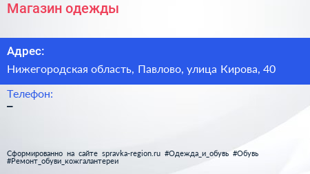 Магазин одежды по адресу Нижегородская область, Павлово, улица Кирова, 40 в дальнейшем Организация, размещена в следующих категориях:
