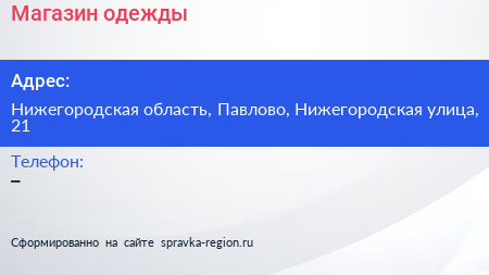 Магазин одежды по адресу Нижегородская область, Павлово, Нижегородская улица, 21 в дальнейшем Организация, размещена в следующих категориях: