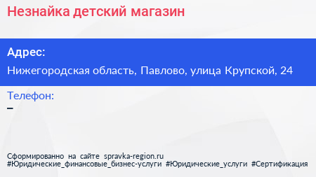 Незнайка, детский магазин по адресу Нижегородская область, Павлово, улица Крупской, 24 в дальнейшем Организация, размещена в следующих категориях: