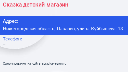 Сказка, детский магазин по адресу Нижегородская область, Павлово, улица Куйбышева, 13 в дальнейшем Организация, размещена в следующих категориях: