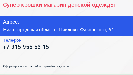 Супер крошки, магазин детской одежды по адресу Нижегородская область, Павлово, Фаворского, 91 в дальнейшем Организация, размещена в следующих категориях: