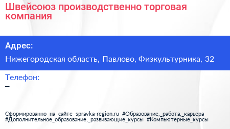 Швейсоюз, производственно-торговая компания по адресу Нижегородская область, Павлово, Физкультурника, 32 в дальнейшем Организация, размещена в следующих категориях:
