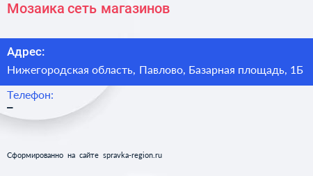 Мозаика, сеть магазинов по адресу Нижегородская область, Павлово, Базарная площадь, 1Б в дальнейшем Организация, размещена в следующих категориях: