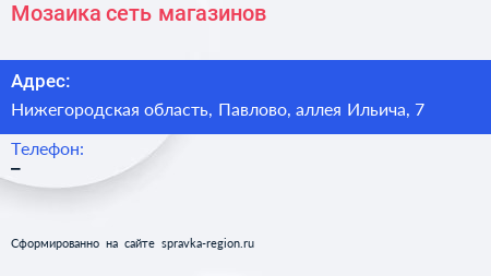 Мозаика, сеть магазинов по адресу Нижегородская область, Павлово, аллея Ильича, 7 в дальнейшем Организация, размещена в следующих категориях: