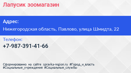 Лапусик, зоомагазин по адресу Нижегородская область, Павлово, улица Шмидта, 22 в дальнейшем Организация, размещена в следующих категориях: