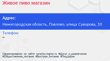 Живое пиво, магазин по адресу Нижегородская область, Павлово, улица Суворова, 10 в дальнейшем Организация, размещена в следующих категориях: