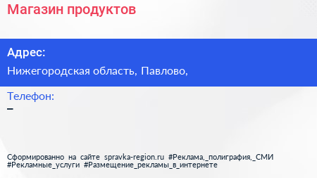 Магазин продуктов по адресу Нижегородская область, Павлово, в дальнейшем Организация, размещена в следующих категориях: