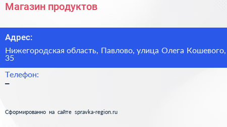 Магазин продуктов по адресу Нижегородская область, Павлово, улица Олега Кошевого, 35 в дальнейшем Организация, размещена в следующих категориях:
